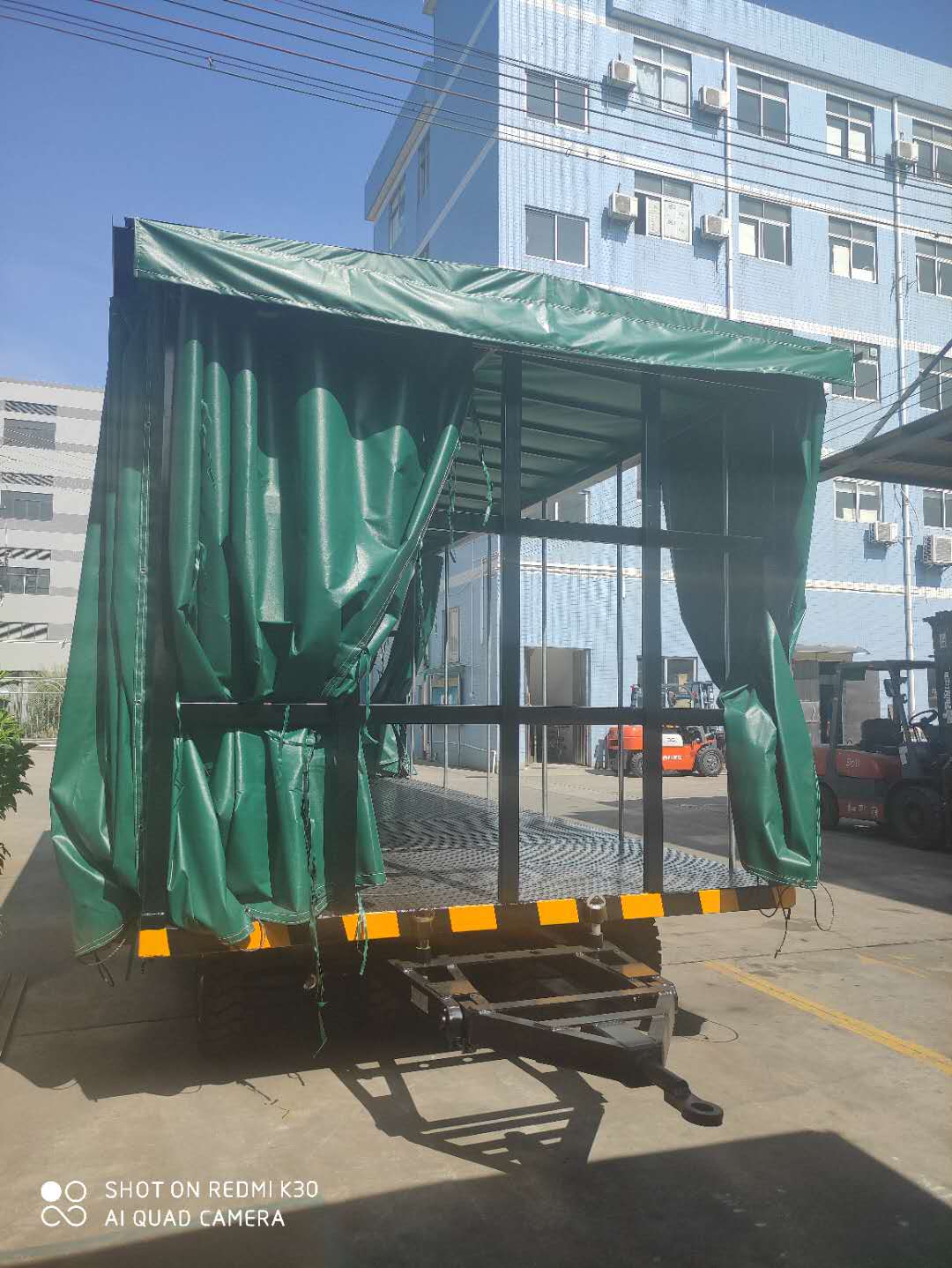 1、平板车载重15吨,载货台面尺寸:6.3*2.8米,主架构为10号型钢结构(主梁三条采用20号型钢),表面铺4MM花纹板。