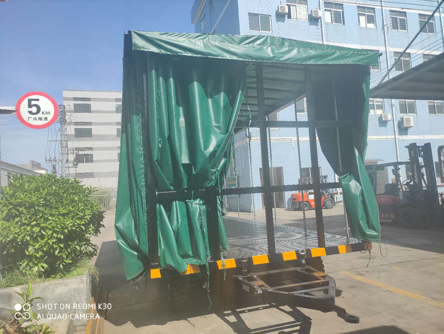 4、双头牵引,前后各一组牵引架,一端牵引时另一端为行走轮,牵引装置为压簧缓冲式牵引机构,(起步或急刹车起缓冲作用),上下可调节固定(上下调动采用两条钢板簧)。